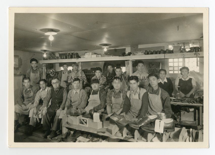 Interior photograph of the Manzanar Co-op Shoe Repair facility with seventeen people in 2 rows, surrounded by shoes and shoe repair tools. Label on top right corner identifies location as "Block 3 Former Ironing Room." Label below photo identifies "Mgr. Hachizo Nomura" who is Shiro Nomura's father.