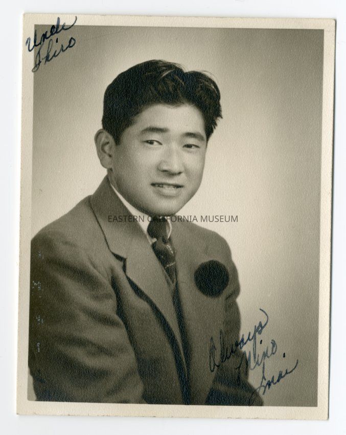Studio portrait of Mino Imai. Label next to him identifies him as part of "Knights," the Manzaknights. On front of photo is written: "Uncle Shiro" and "Always Mino Imai."Collection