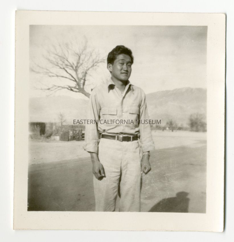 Exterior photograph of young man identified as Jun Okimoto, Manzaknight, standing with a tree behind him and mountains in the background.Collection