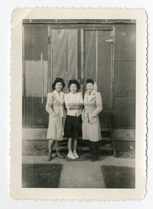Exterior photograph of sisters Tillie, Mae, and Mary Kageyama (Nomura) in '43 standing in front of a closed door to a barracks apartment.