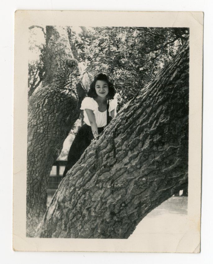 Exterior photograph of young woman on a large branch of a tree. Woman is probably Miyo Nishi, a member of the Forget-Me-Nots at Manzanar.