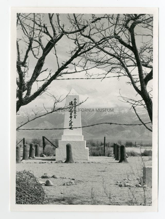 Photo taken through strands of barbed wire of the Tower of Memory (Ireito), also referred to as the cemetery monument, at Manzanar. This photo was taken in August 1943.Photograph Details