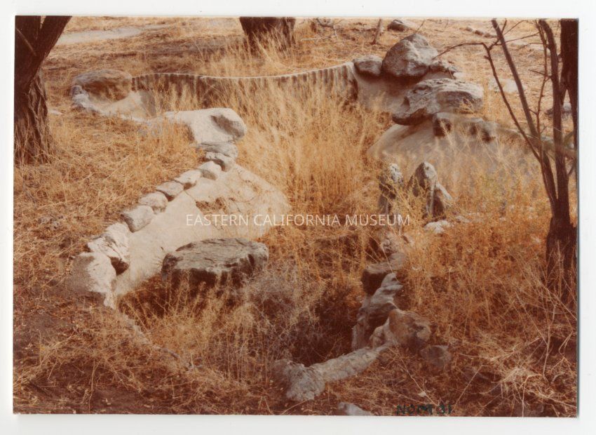 Color photograph of remains of Block 12 garden with rocks, concrete, and brush.