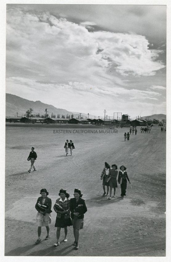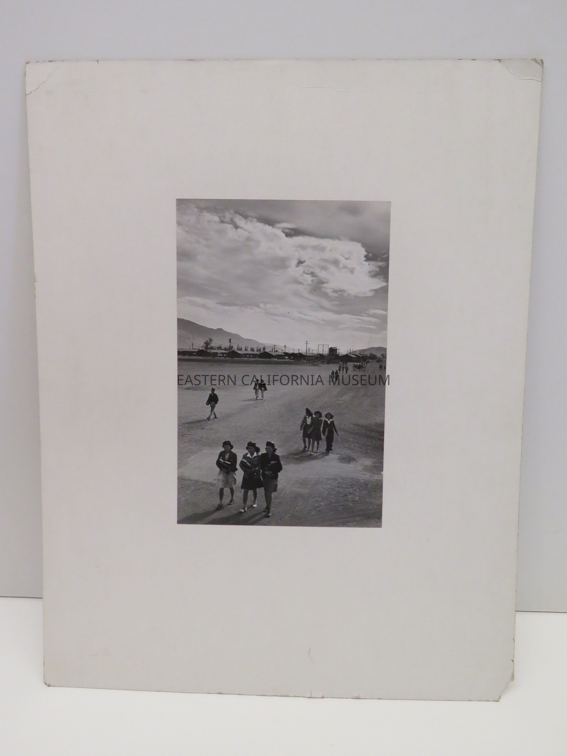 Mounted Ansel Adams photograph of students walking along a dirt road, either to or from classes at Manzanar War Relocation Center. Buildings, barracks, and baseball field in background.
