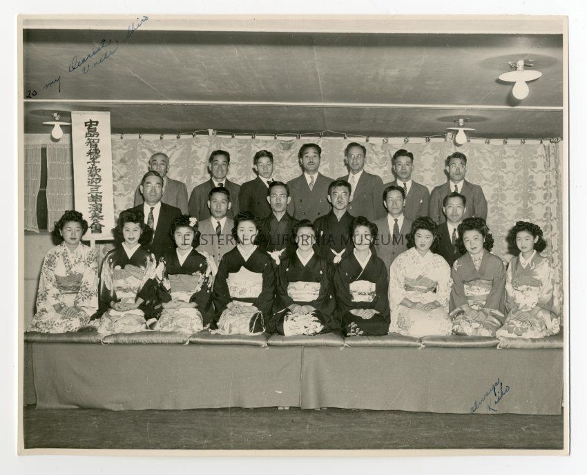 Photo of 13 men and 9 women are on a raised platform in a barracks building. The women are wearing traditional Japanese clothing and kneeling in the front row. The men are wearing suits and are in 2 rows standing behind the women. Written on the photo is "To My Dearest Uncle Shiro, Always, Keiko."Photograph Details