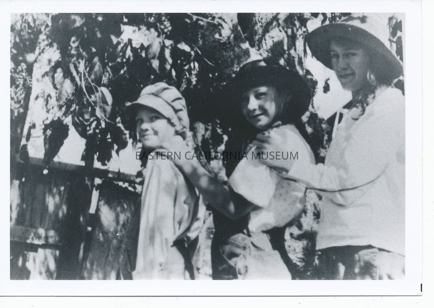 Copy of a photo of three girls posing together outside under a tree. Fence in background.