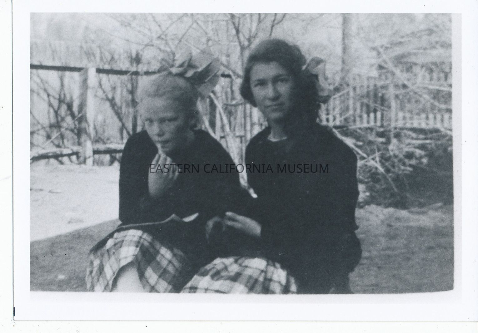 Copy of a photo of two girls sitting in what might be a yard wearing matching uniforms or outfits with big bows in their hair. Fence in background. One of the girls may be Charlotte Natalie Passino of Lone Pine.Collection