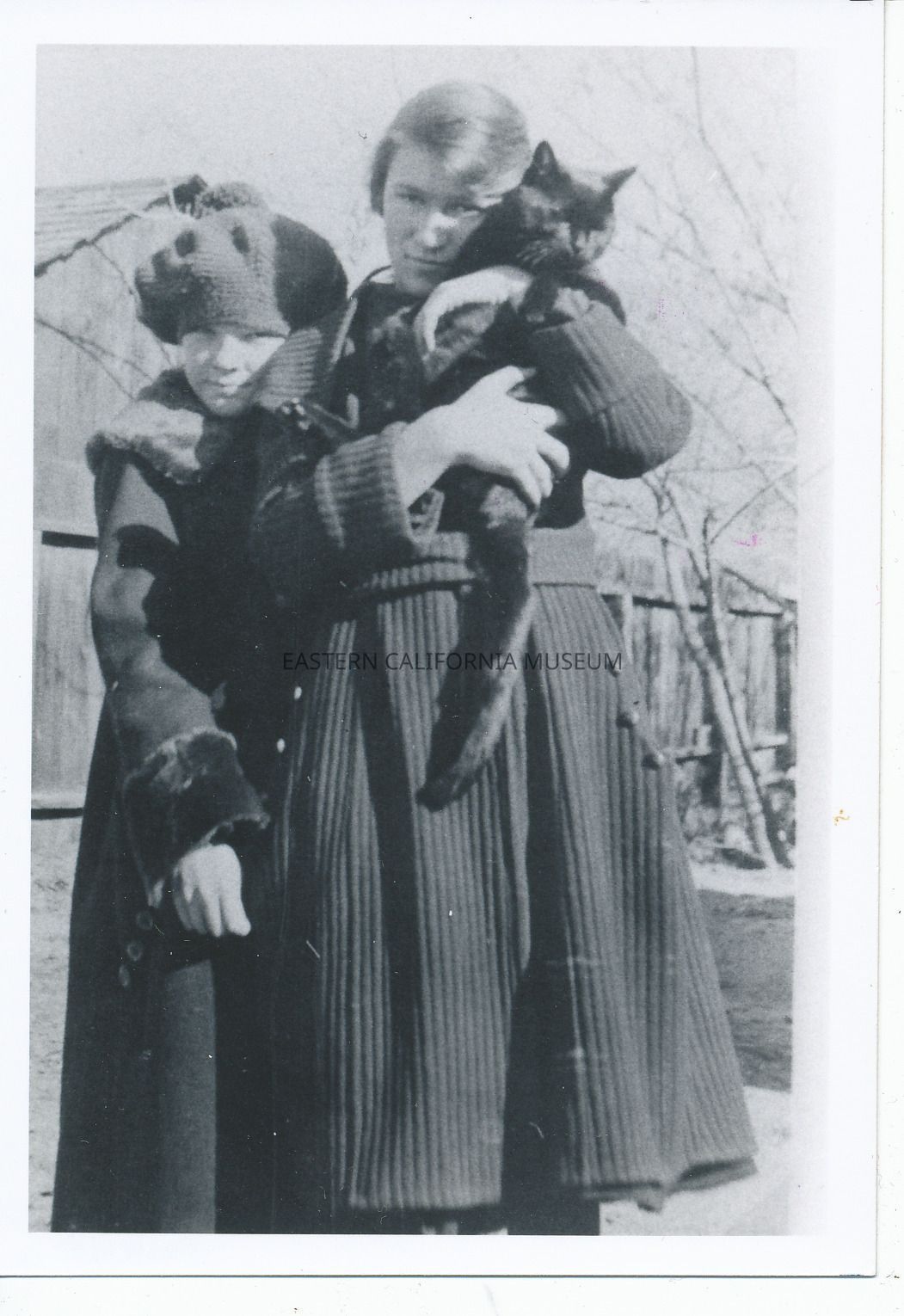 Copy of a photo of two girls posing outside: one girl is wearing a hat and a fur lined coat, the other girl is holding a black cat. Building in background.