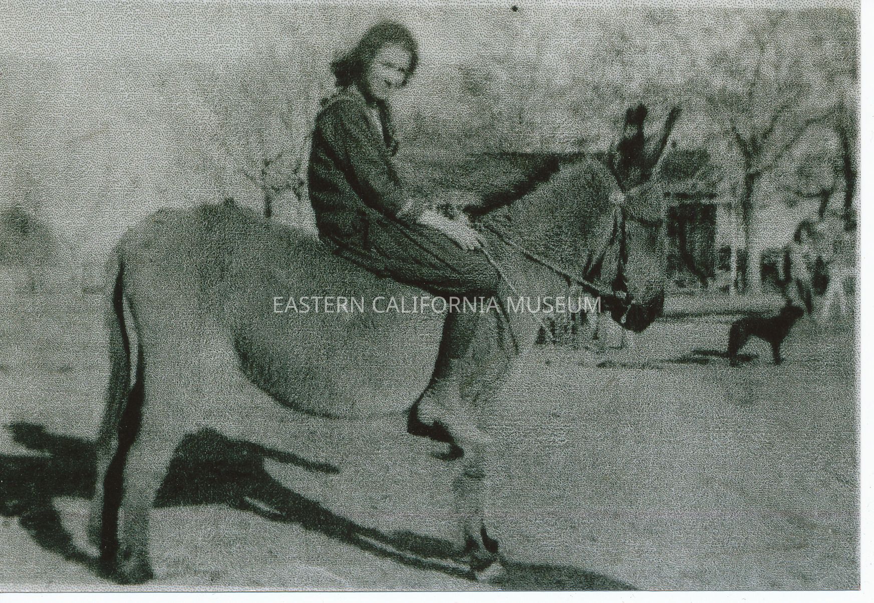 Grainy copy of a photo of a woman sitting on a mule/burro/donkey bareback. House, dog, other people in background. She may be Charlotte Natalie Passino of Lone Pine.Collection