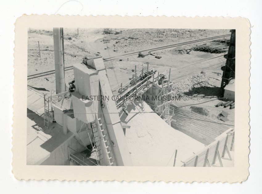 Photo of the Pacific Alkali Company (PPG) plant. Two men in middle-left section, large pile of material is the focus of photo.