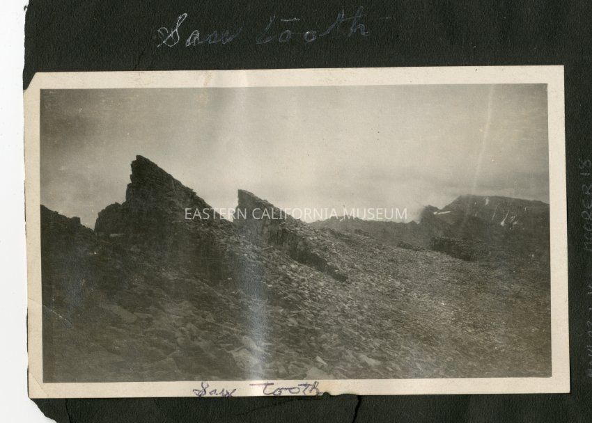 Photo is labeled "Saw Tooth." Sharp looking mountain peaks with rocks all around.