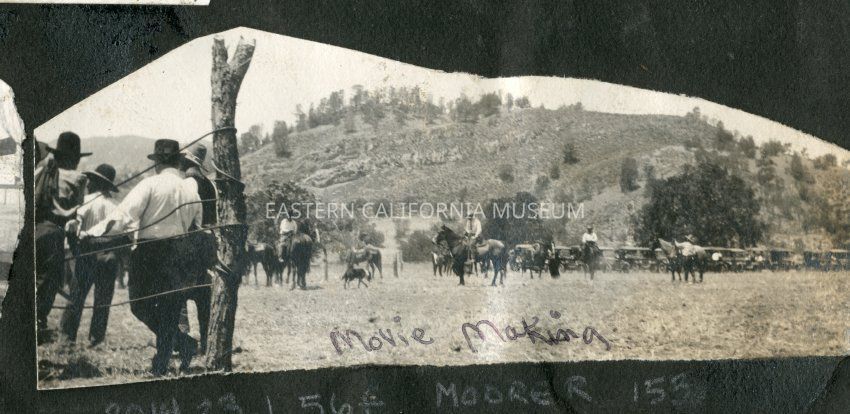Photo of a field with horses and men. Caption on the bottom says, "Movie Making."