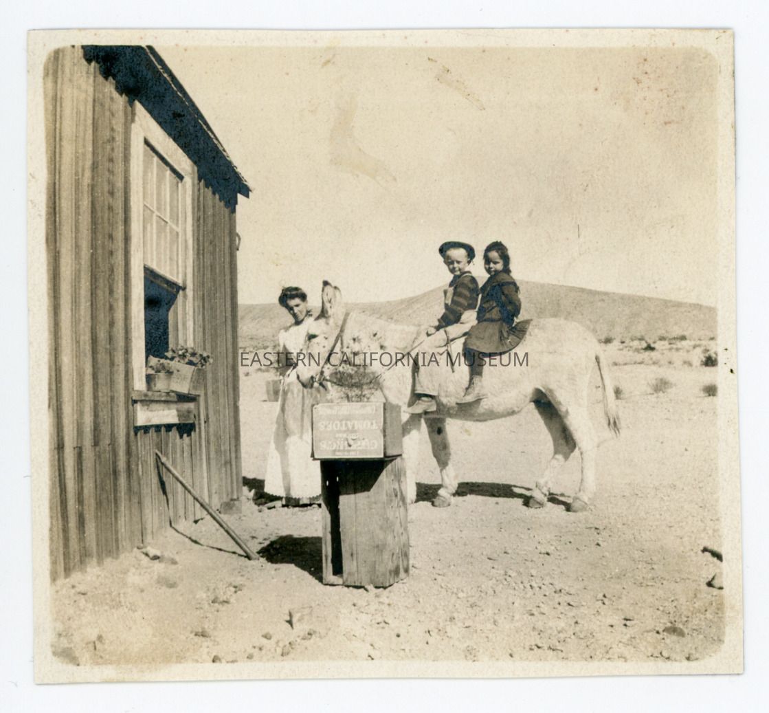 Photo of two small children sitting on a mule or burro next to a house. There is a woman, likely their mother, beside them. A fruit crate for tomatoes is being used as a planter.