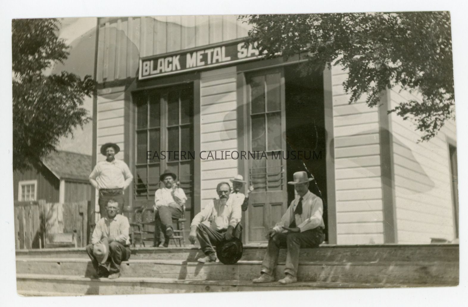 Photo of a group of six men sitting on the front porch of the Black Metal Saloon in Darwin, CA.