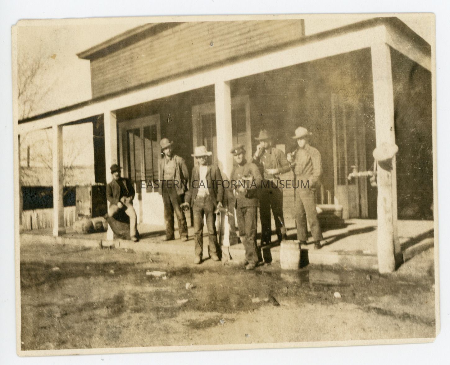 Photo of a group of six men standing on the front porch of a building. Dirt road in front, possibly a safe on the far left of the photo. Water spigot and trough on right side of building. One man appears to be in a uniform of some sort.
