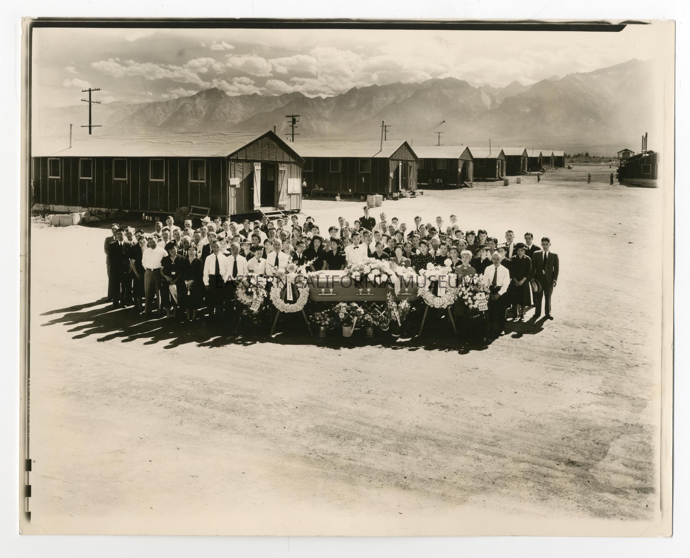 Exterior funeral scene at Manzanar War Relocation Center looking west towards Sierra Nevada mountain range. Photo appears to have been taken from a raised location. Location may be block 6.Photograph Details