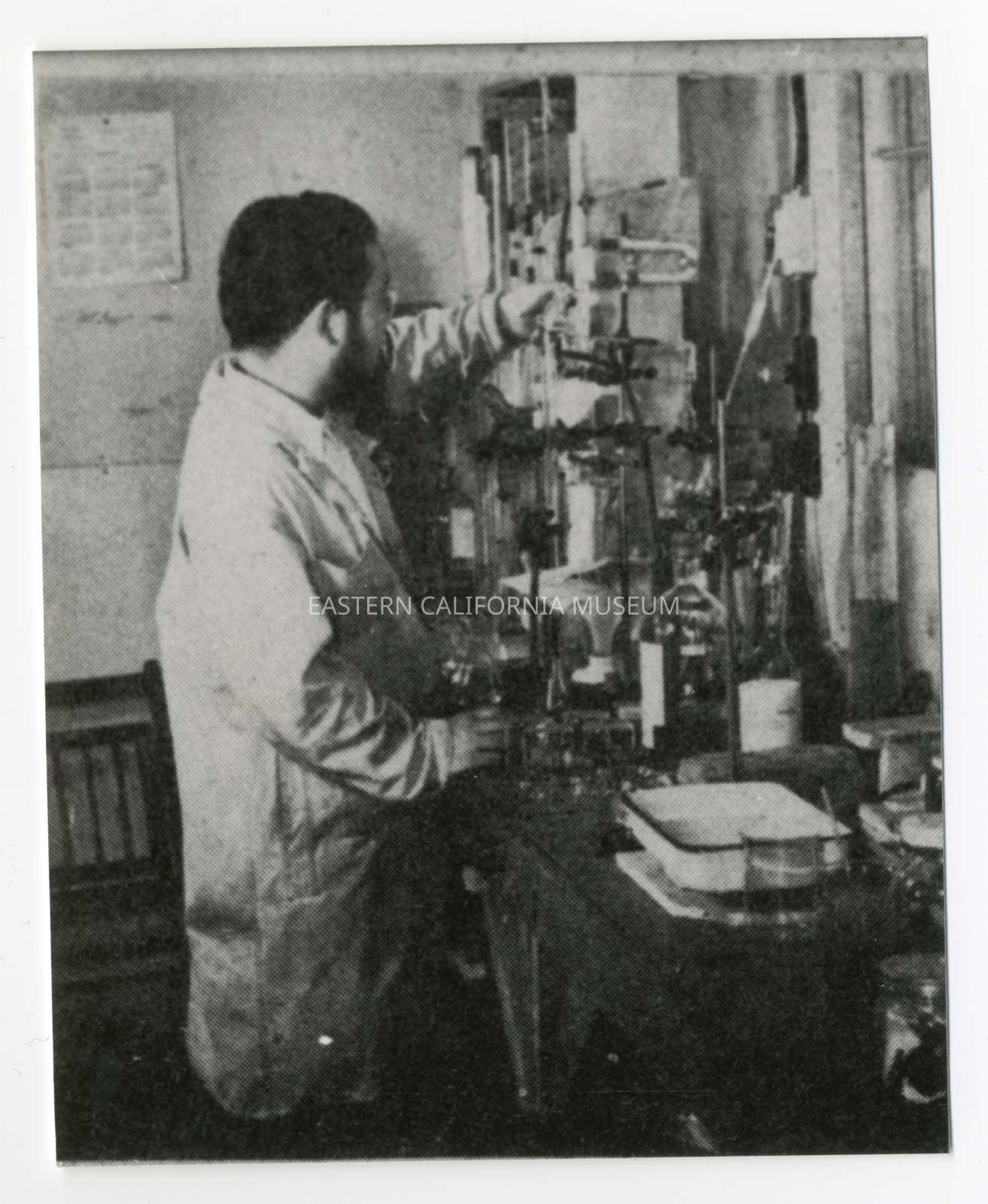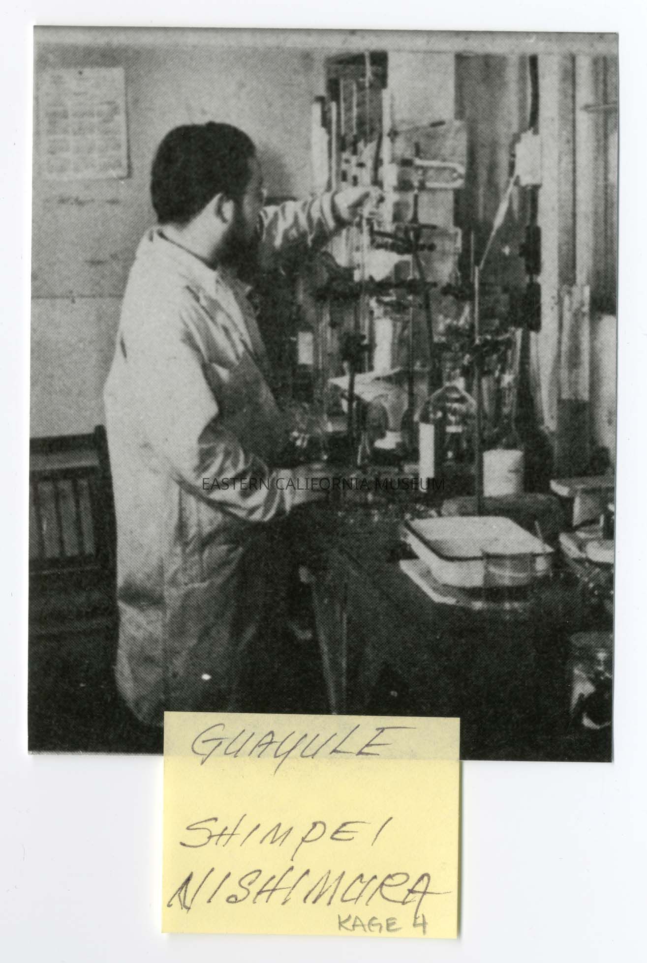 Appears to be a copy of a photo from a publication of Shimpe Nishimura in the Guayule Project laboratory. This print was made in April 1984.Photograph Details