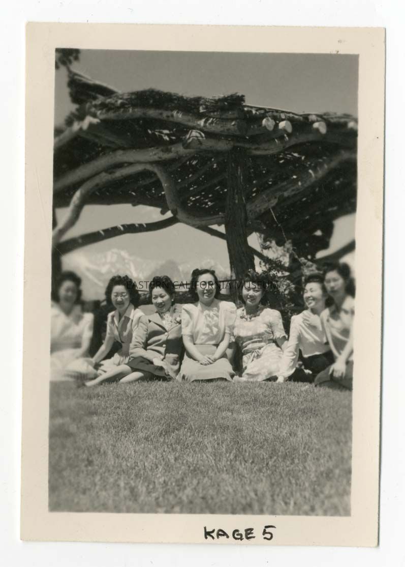 Photo of seven young women sitting on grass under a log pergola, possibly at Pleasure Park. The Sierra Nevada mountain range is visible in the background.Photograph Details