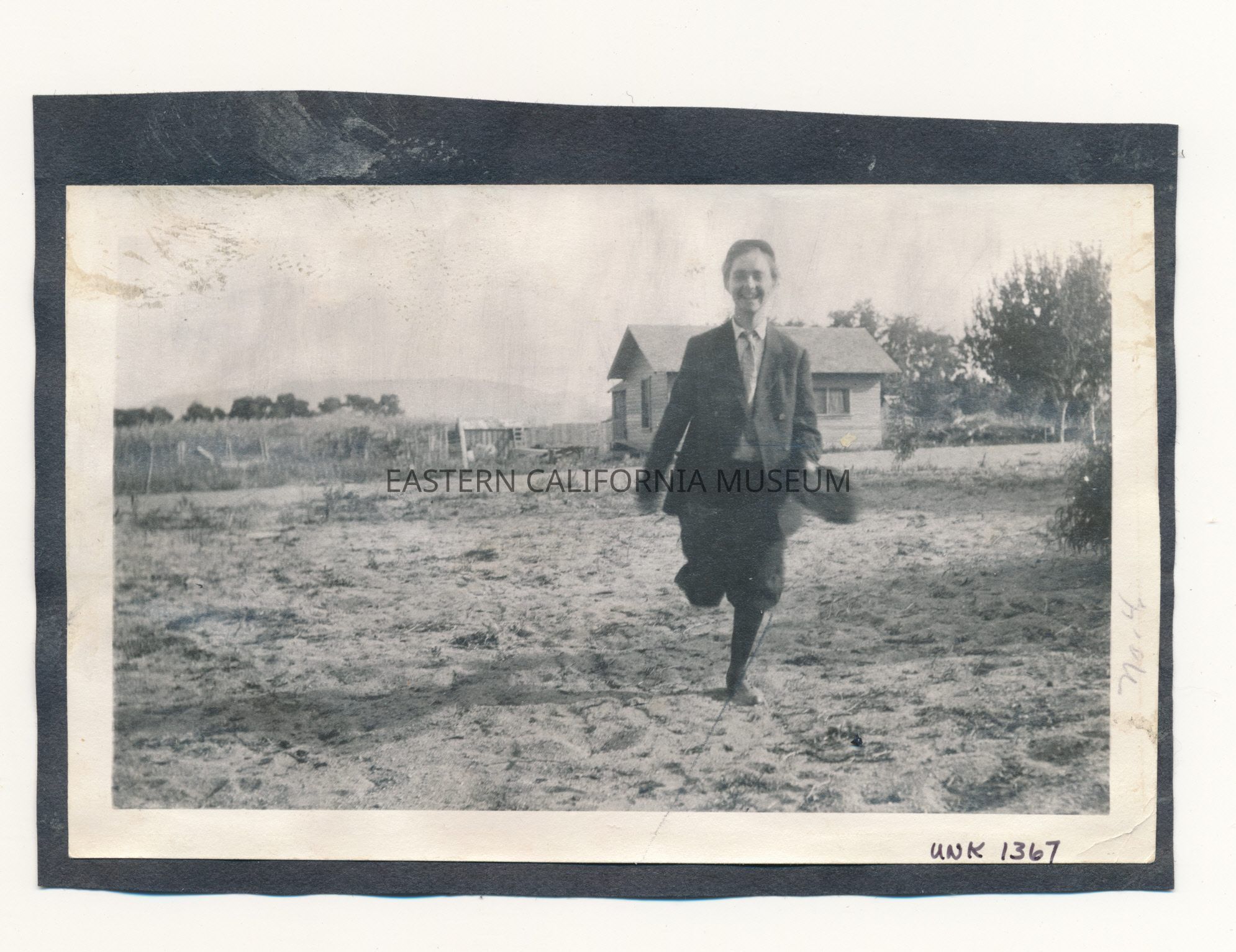 Photo of a young girl dressed in men's clothing (pants, white shirt, jacket, tie, and hat in hand) running towards the camera. There is a house in the background, possibly Anna Glade's home. The location may be the Manzanar area.