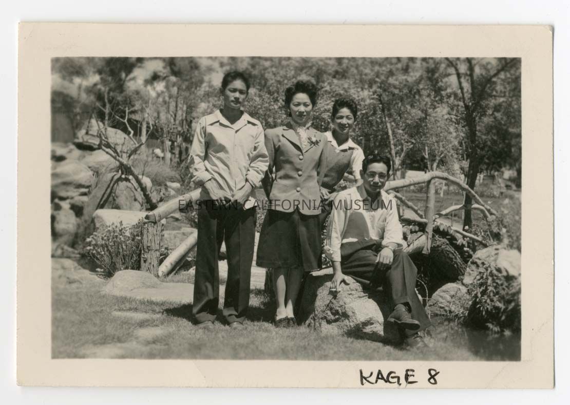 Photo of four people outside near a log bridge, likely in Pleasure Park. One man is sitting while the other three stand behind him.Photograph Details