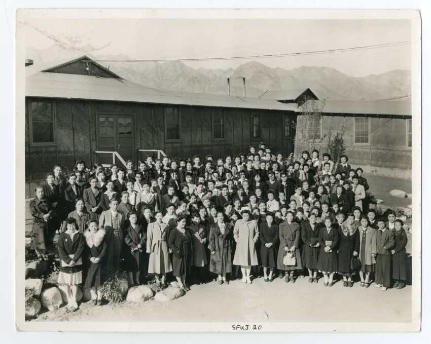 Exterior photograph of an estimated 135 people, two are men and the rest are women, standing in a group in front of the Manzanar hospital building. All our wearing winter coats, and the Sierra are in the background.