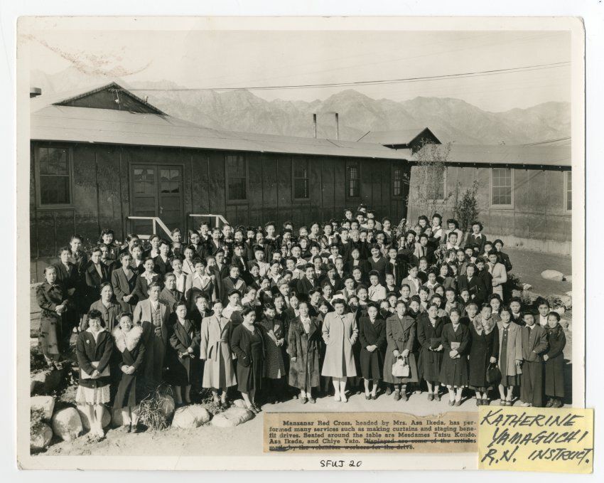 Affixed to the bottom edge of the photo is a label and a clipping from a newspaper. The yellow post-it label says: "Katherine Yamaguchi R. N. Instruct." The newspaper clipping mentions the Red Cross and gives several names: