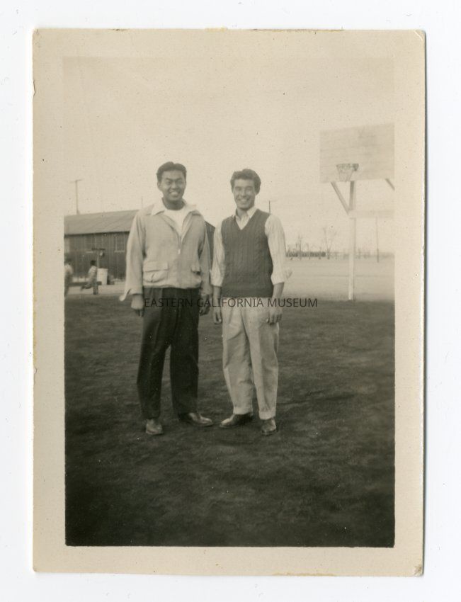 Exterior photograph of two young men standing and facing the camera. Behind the men a barracks building, and a basketball backboard and hoop are visible. A label under photo identifies them as Yo Ishida and Shi Nomura, co-advisors for the Manzaknights.Photograph Details