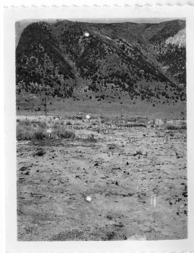 B&W glossy print: with scalloped edges; valley floor with hillside in background