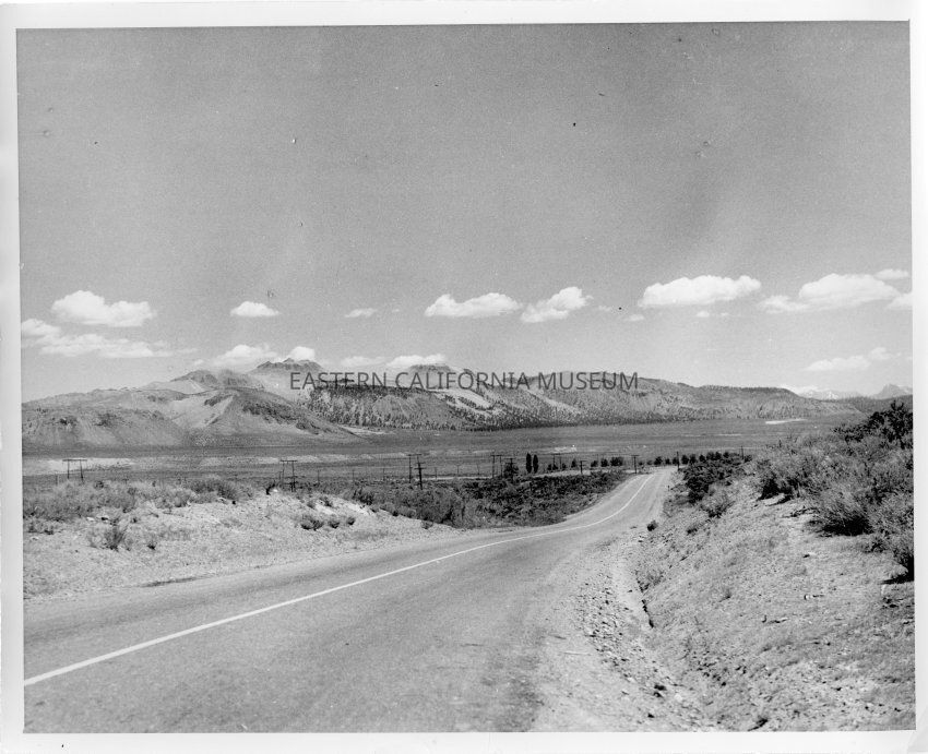 B&W glossy print: Highway 395 looking south; Mono Craters in background