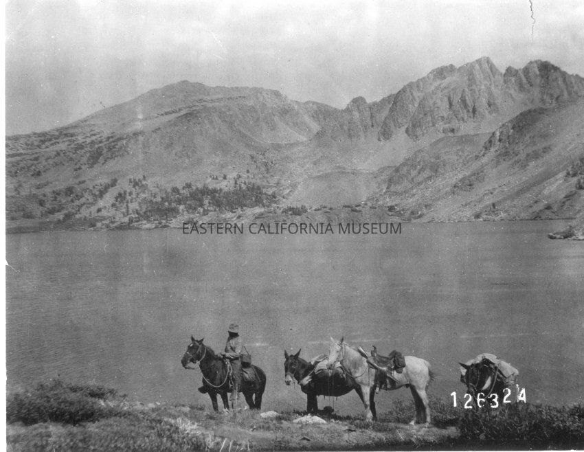 B&W glossy print: man on horseback with 3 pack mules, beside large lake