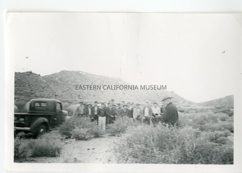 B&W glossy print: group of men in sagebrush, one man appears to be speaking to the group, early model truck