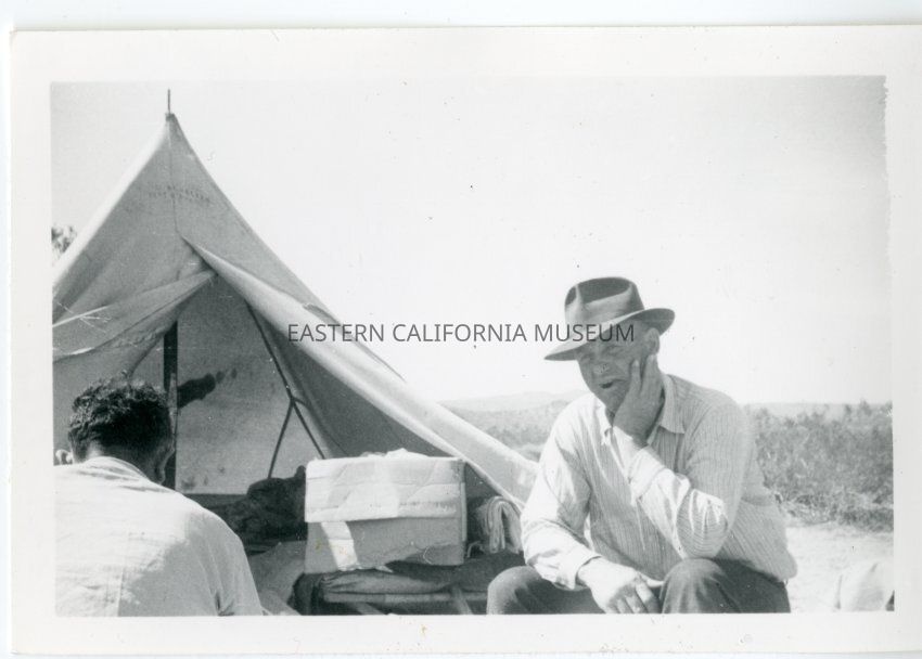 B&W glossy print: man sitting in front of a center pole tent