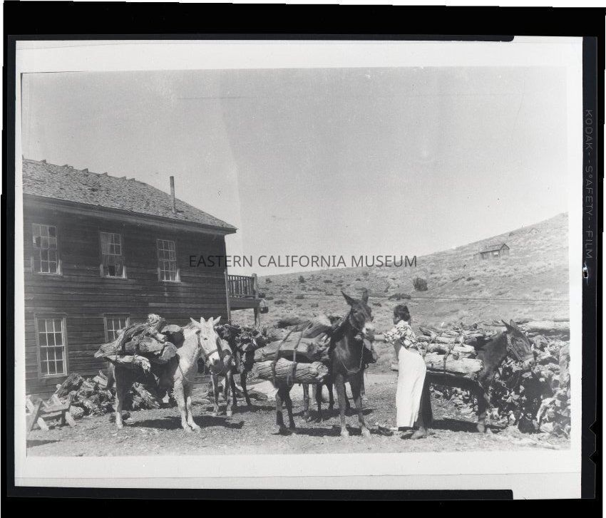 Photo of mules hauling wood to the American Hotel in Cerro Gordo, about 1895. Photo was copied in 1959 courtesy of W. Willson.