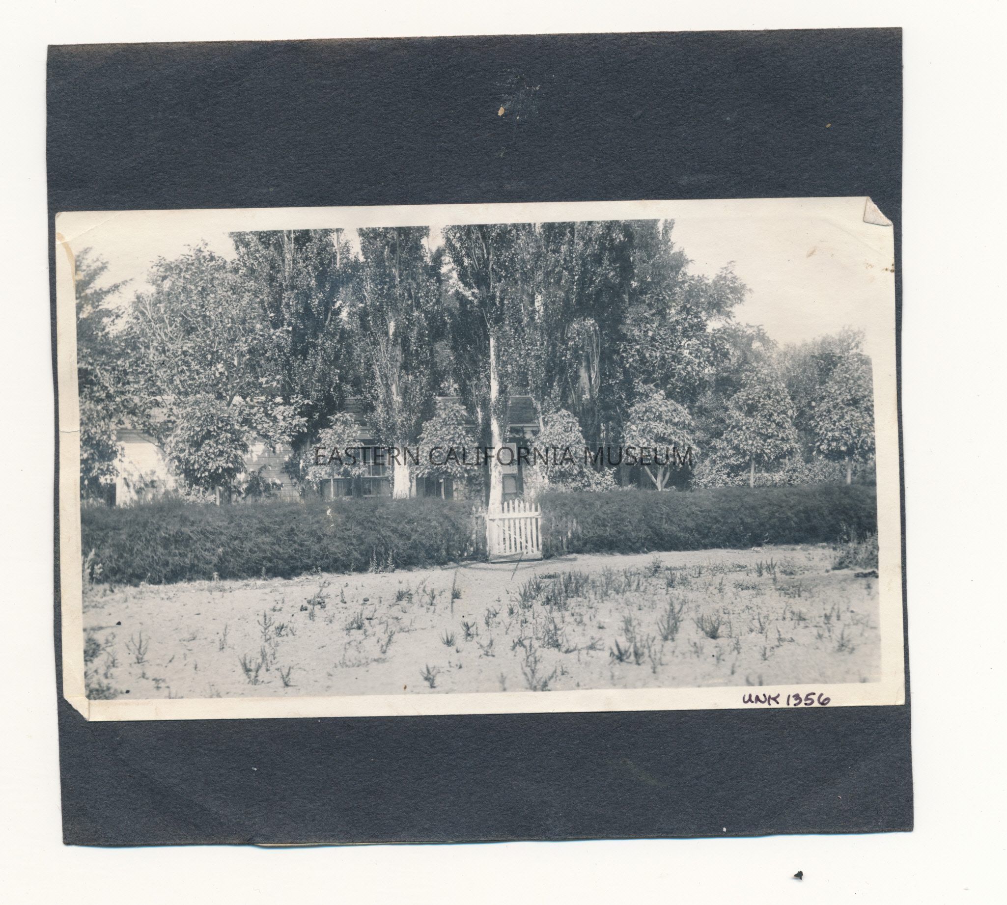 Photo of a house with many different types of trees around it. There is a white picket gate in front and a hedge. Location unknown, but possibly the Manzanar area?