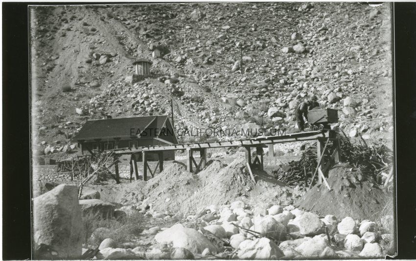 B&W glossy print: 2 men with ore cart on raised track; appears to be a construction site