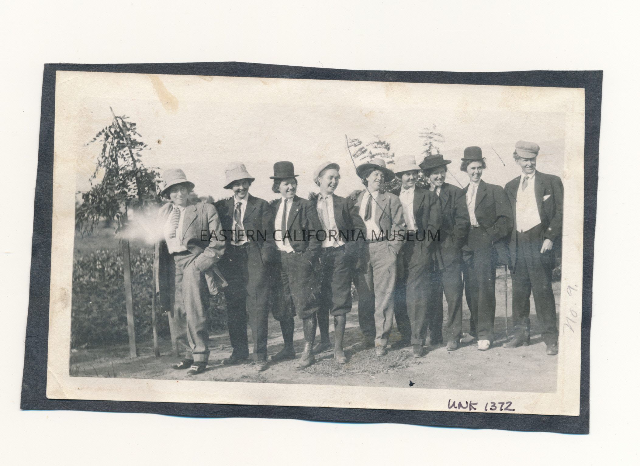 Photo of nine people in a line with their right hand resting on the right shoulder of the person to their right. They are women dressed in men's clothing (pants, white shirt, jacket, tie, and hat).
