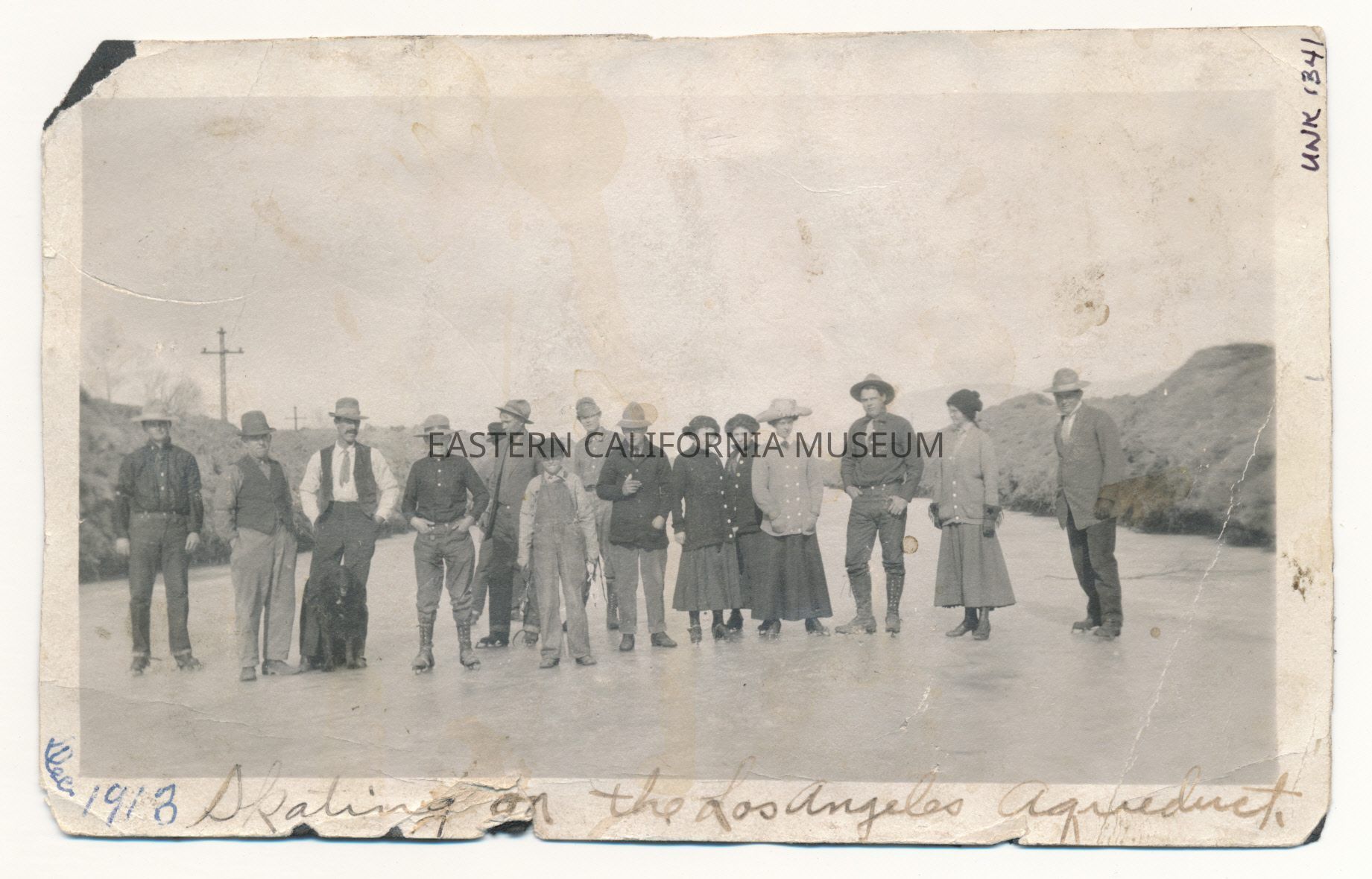 Photo of a group of about 15 people standing on the frozen aqueduct. Written below the image in faded ink is, "Skating on the Los Angeles Aqueduct" and someone has added "Dec. 1913" in blue ink.