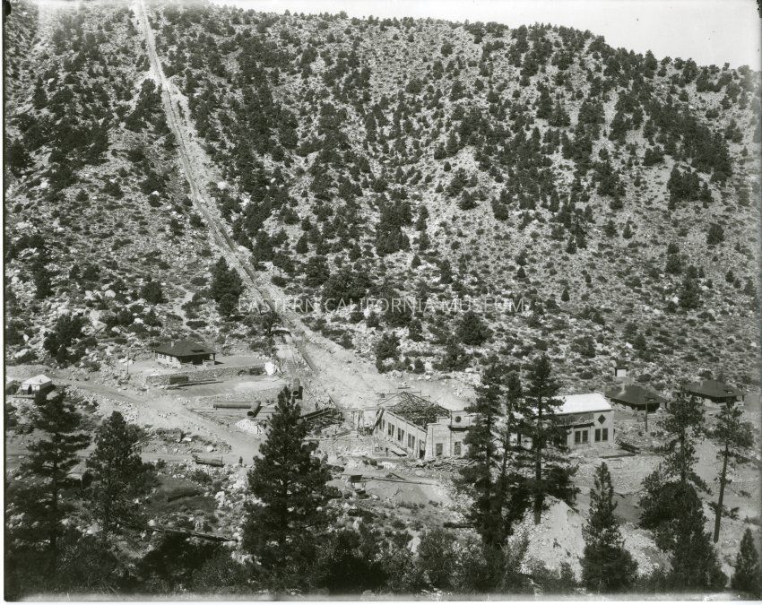 B&W glossy print: looking down on building and long track going up the side of a mountain; signs of construction