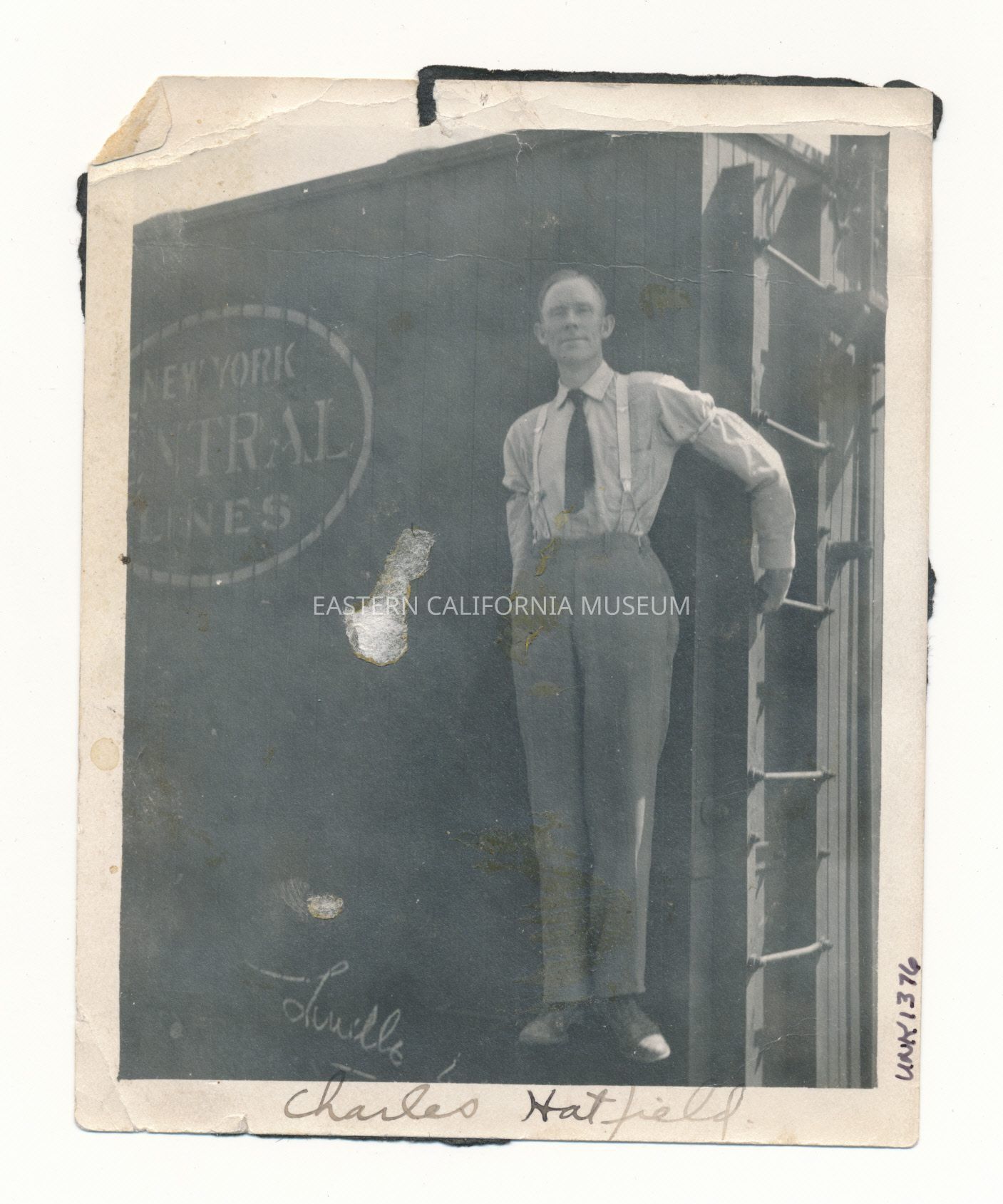 Photo of a man standing on a New York Central Lines boxcar. He is identified as Charles Hatfield.