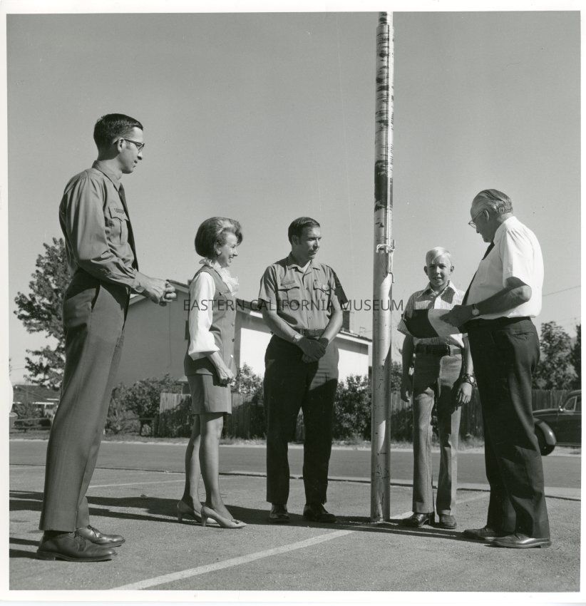 B&W glossy print: several people, one in uniform, standing at a flag pole for a flag presentation