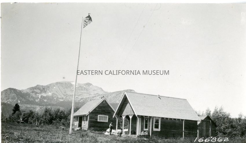 B&W glossy print: ranger station with flag pole and flag; Mammoth Mountain in background
