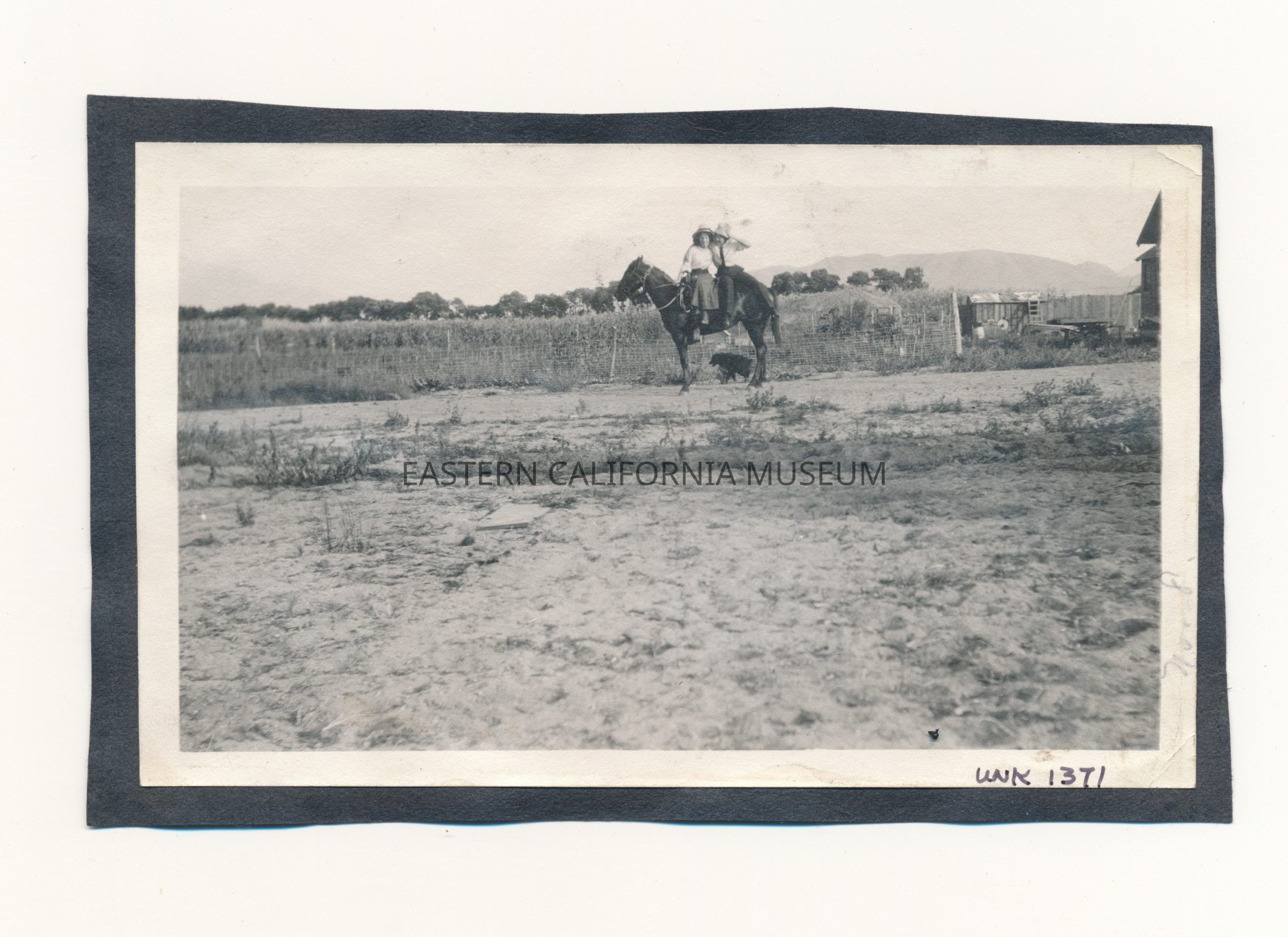 Photo of two people mounted on the same horse. The person on the right appears to be a woman dressed in men's clothing. There is a field of some crop growing in the background. The location may be the Manzanar area.