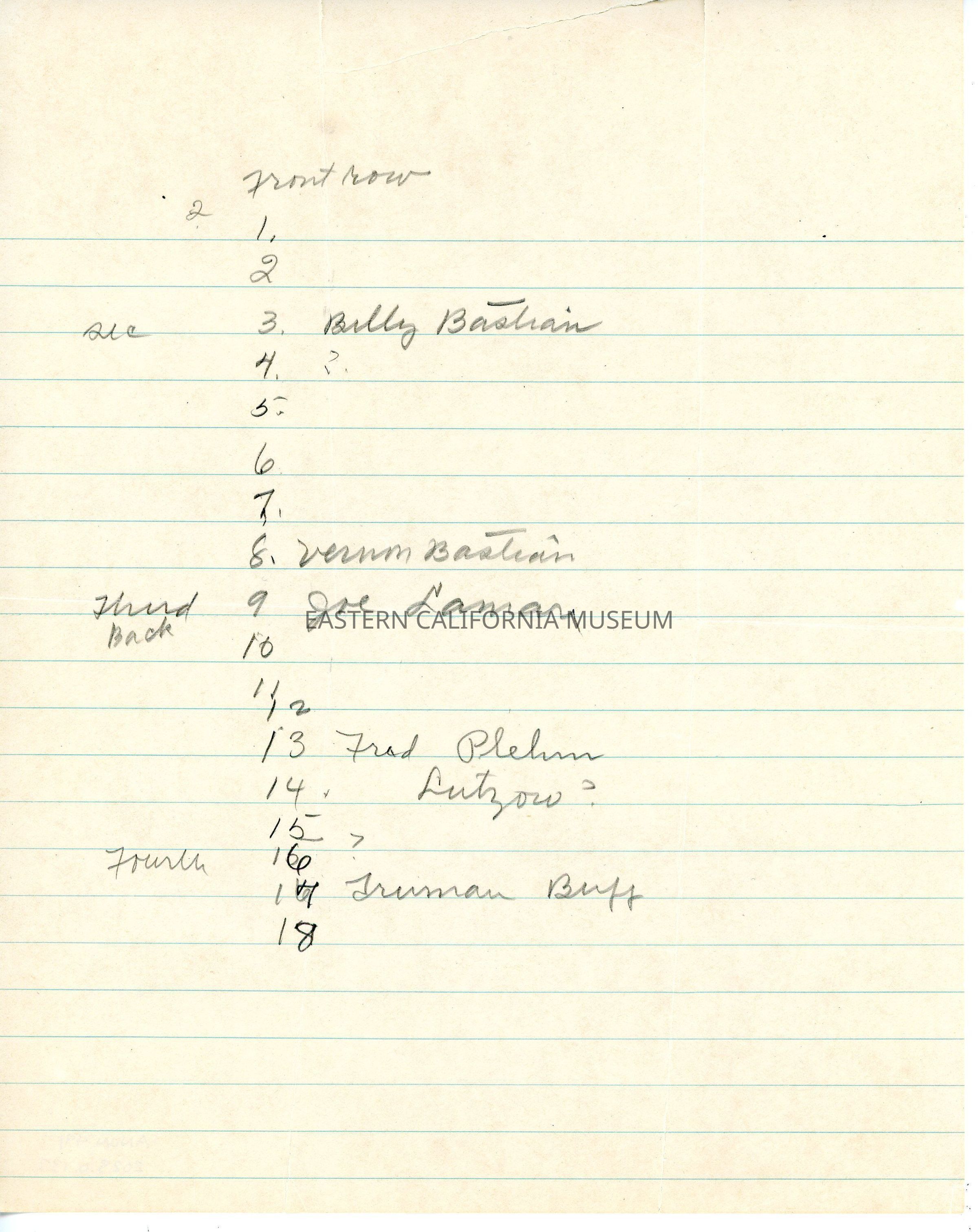A few of them have been identified on a separate piece of paper: Billy Bastian, Vernon Bastian, Joe Lamar, Fred Plehn, Lutzow (?), and Truman Buff.