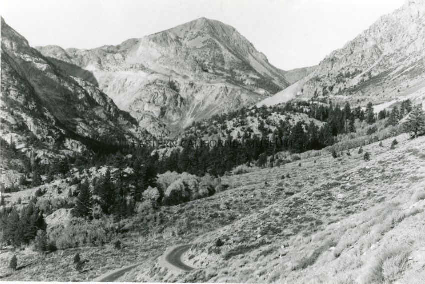 B&W glossy print: Lee Vining canyon showing parts of Tioga Pass Road