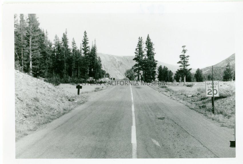 B&W glossy print: paved road with center stripe; in with other Tioga Pass Road photos