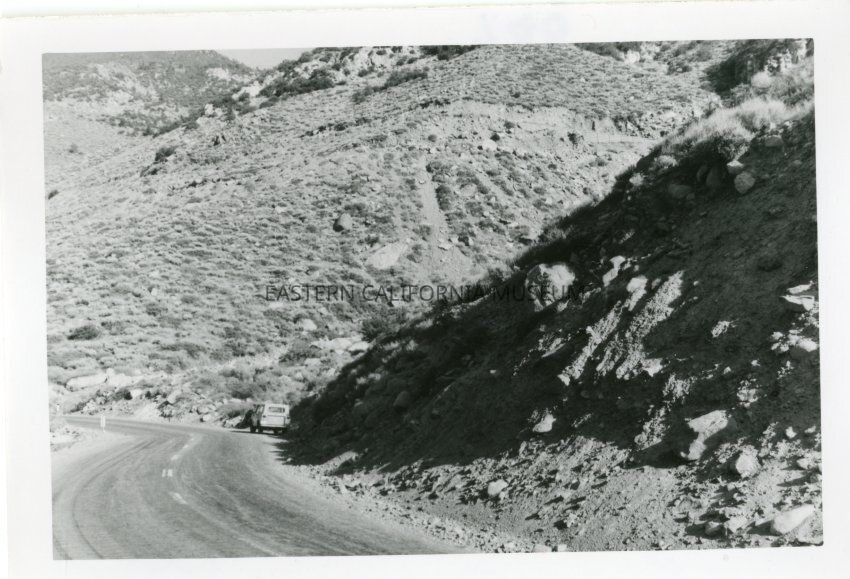 B&W glossy print: paved road; portion of Tioga Pass Road