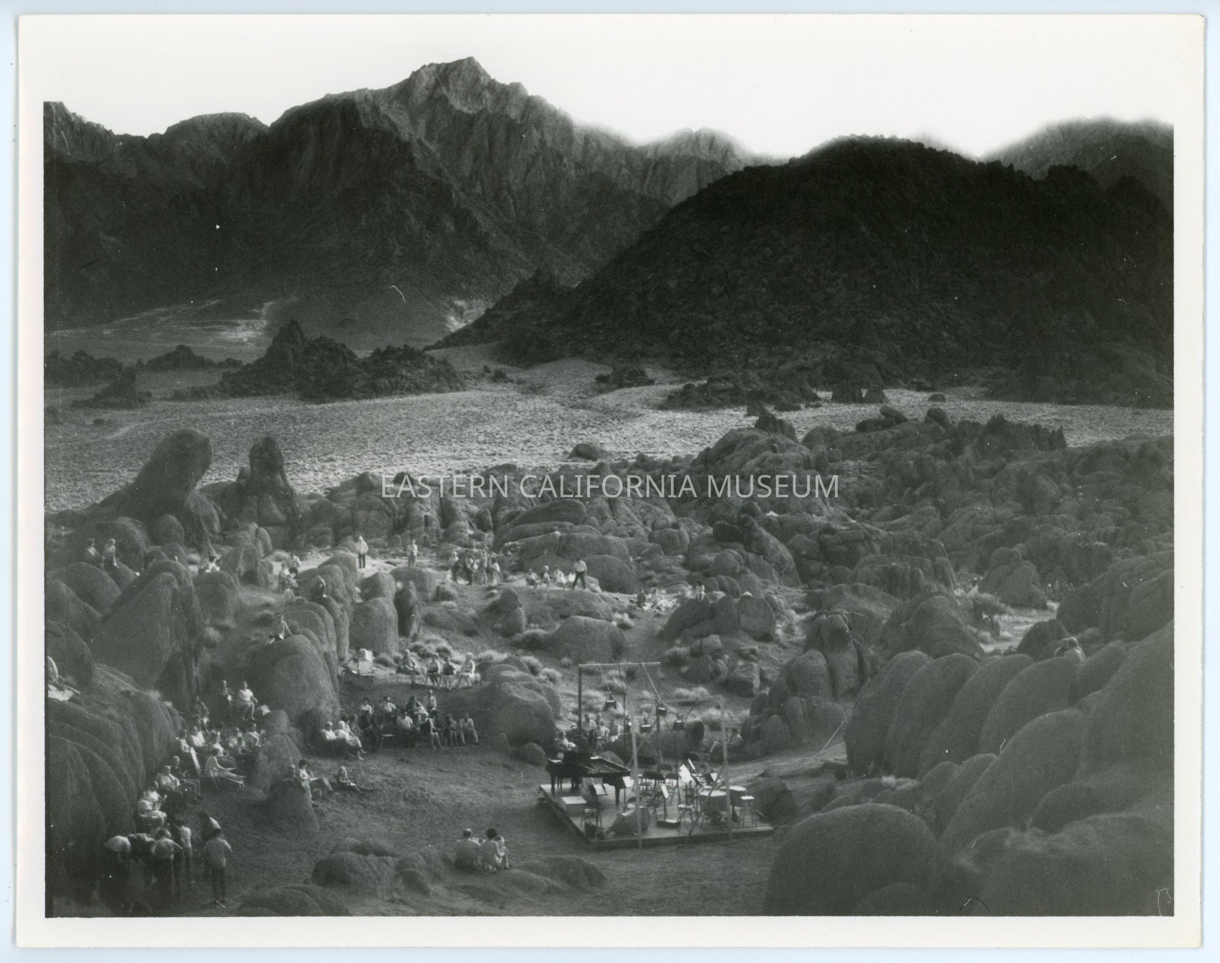 Photo of the stage for the Deepest Valley Theatre in the Alabama Hills. There are many people watching or waiting for the performance.