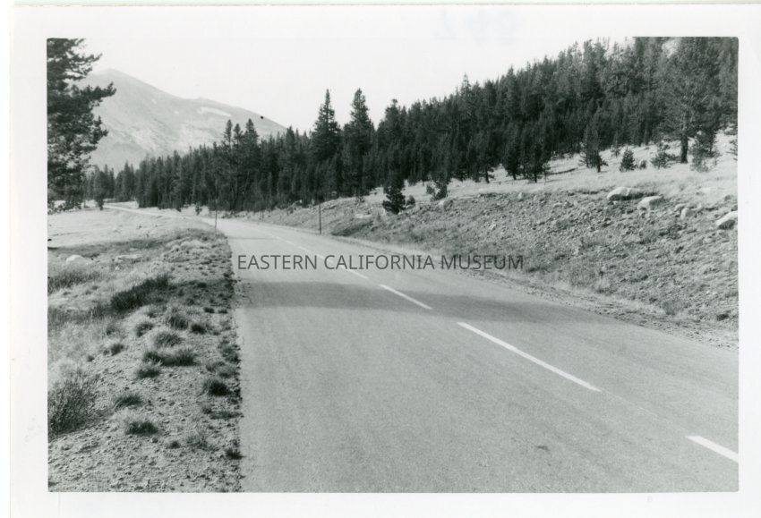 B&W glossy print: paved road, possibly heading toward Tuolumne Meadows in Yosemite National Park