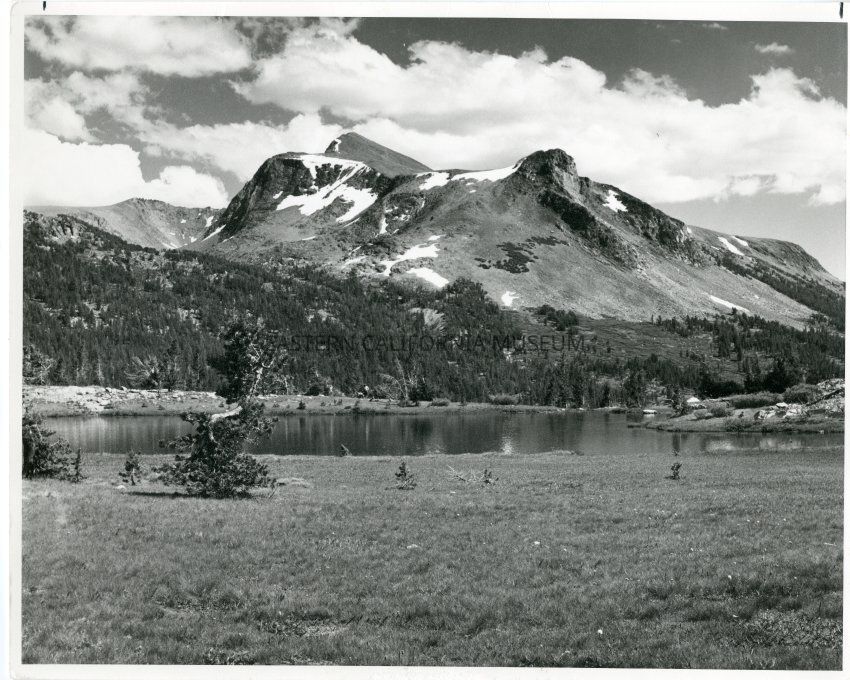 B&W matte print: high sierra landscape, lake in foreground, Mount Dana in background