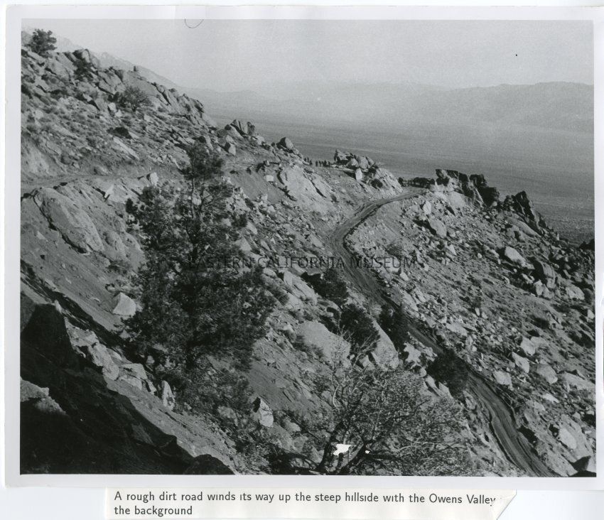 B&W glossy print: A rough dirt road winds its way up the steep hillside with the Owens Valley in the background.